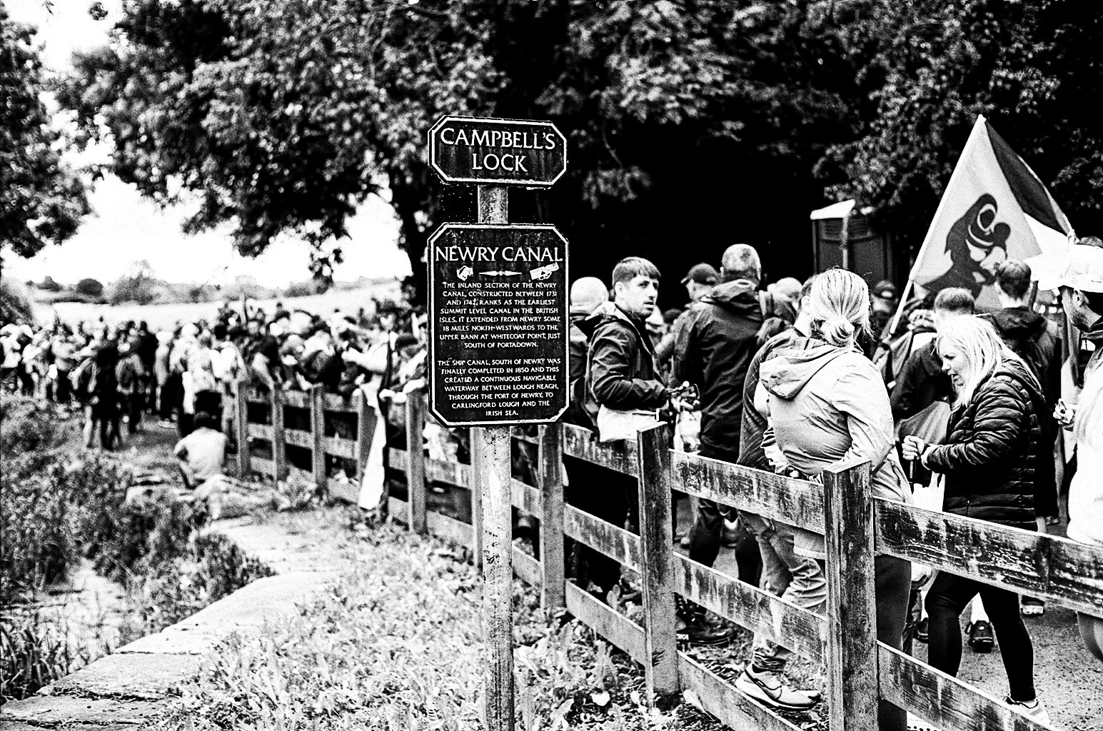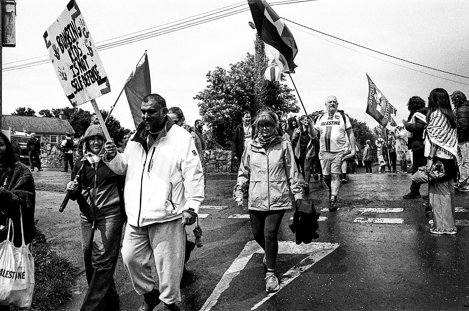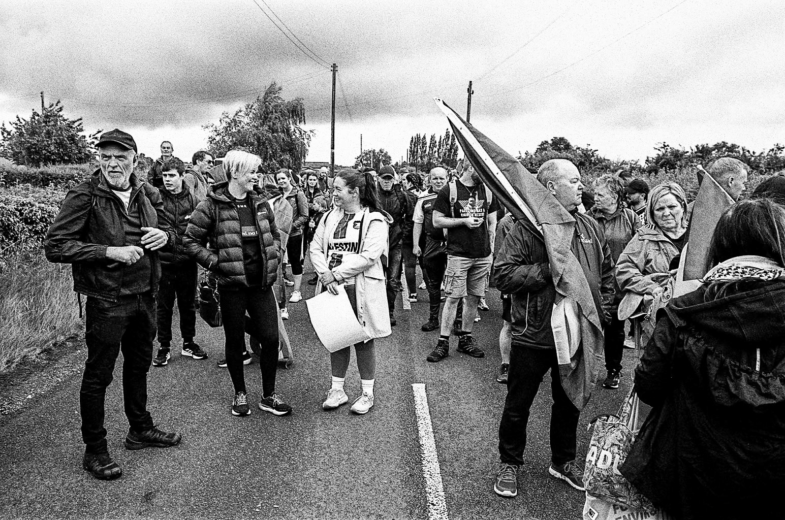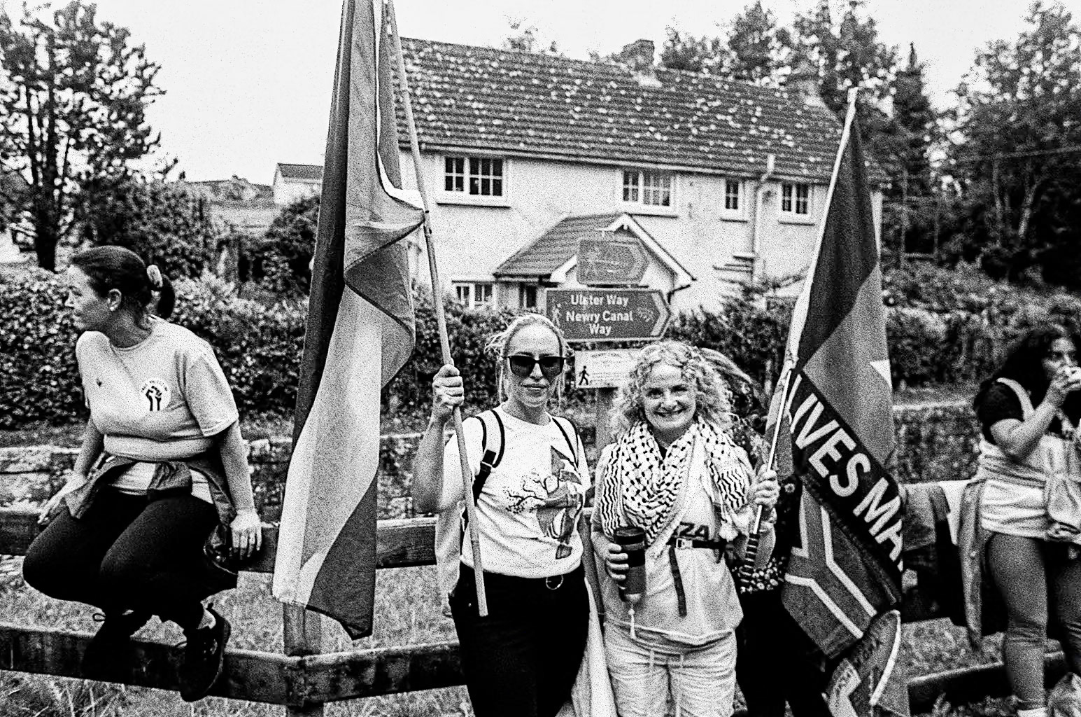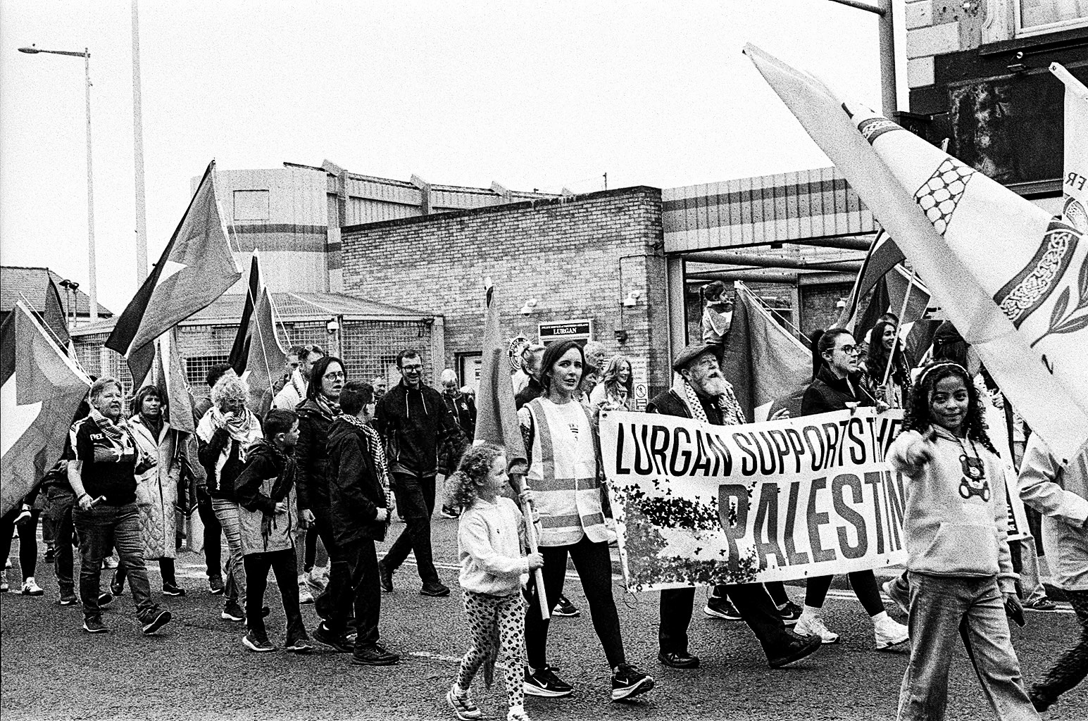 I documented several protests for Gazza including a long walk from Lurgan, County Armagh to Newry, County Down. I used the same equipment and film stocks of the mid-late 20th Century that covered US civil rights and anti Vietnam protests. My aim was to draw contemporary protest photos with pen and inks used by their historical forebears. Working in this fashion I hope to draw parallels and remove aesthetic differences to enable greater understanding.