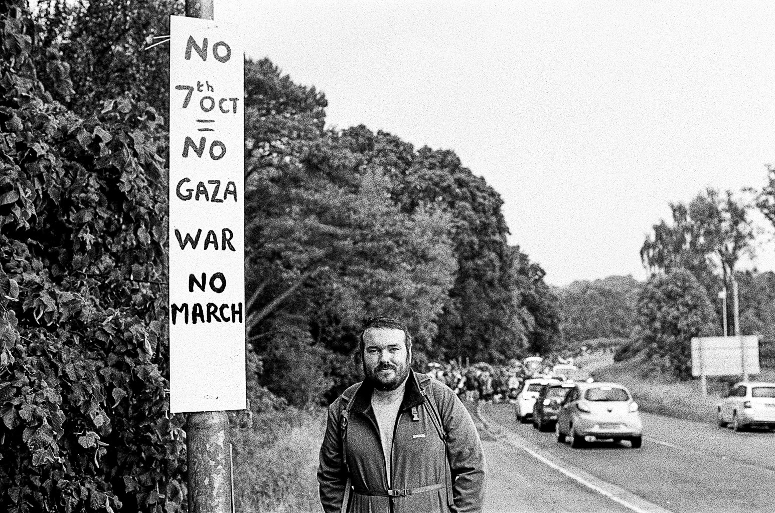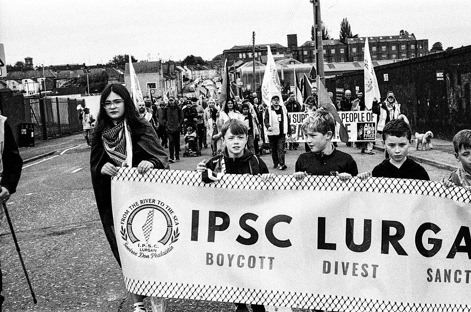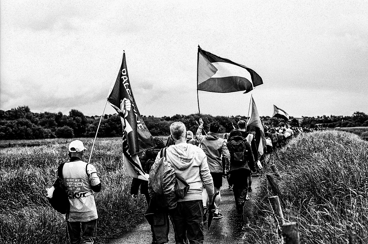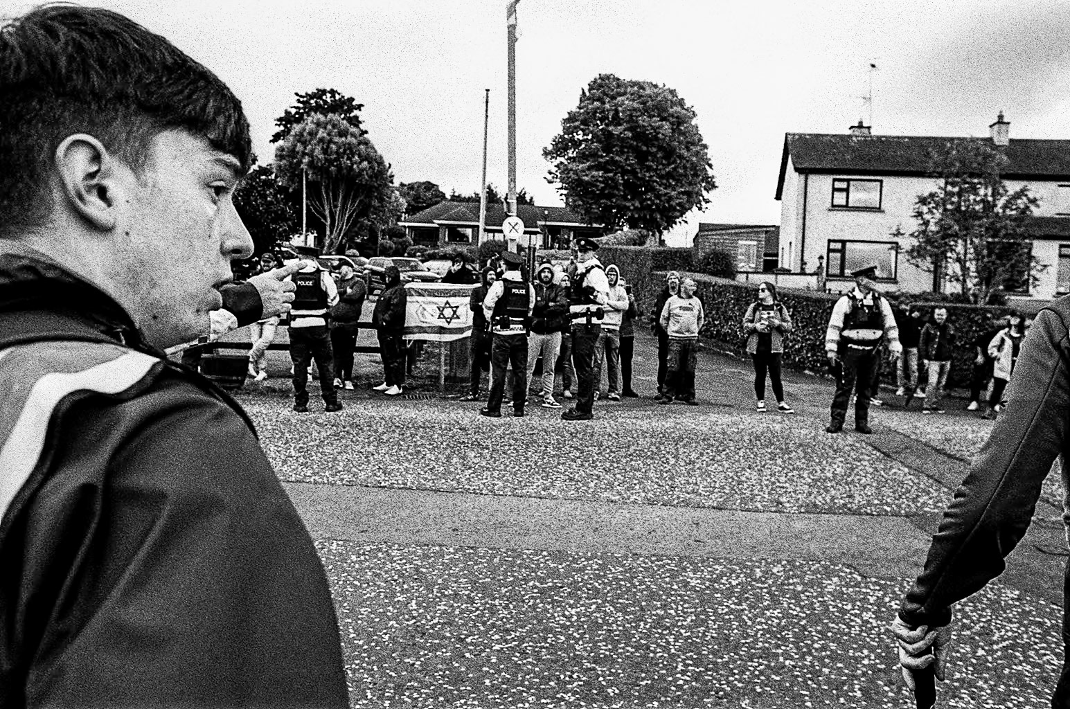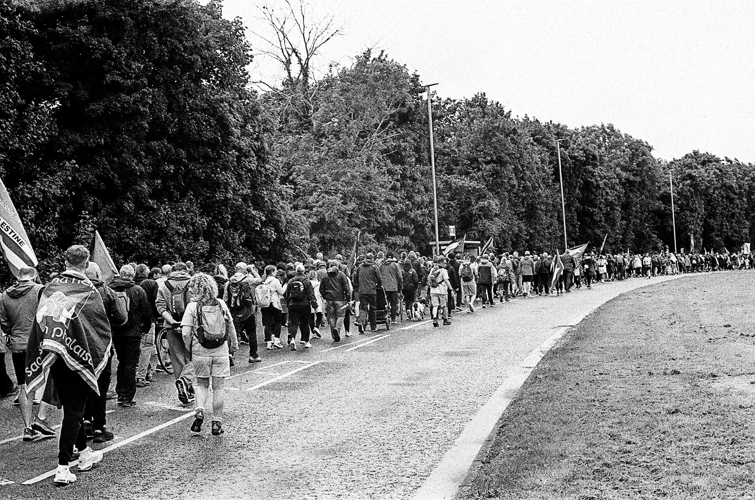 I documented several protests for Gazza including a long walk from Lurgan, County Armagh to Newry, County Down. I used the same equipment and film stocks of the mid-late 20th Century that covered US civil rights and anti Vietnam protests. My aim was to draw contemporary protest photos with pen and inks used by their historical forebears. Working in this fashion I hope to draw parallels and remove aesthetic differences to enable greater understanding.