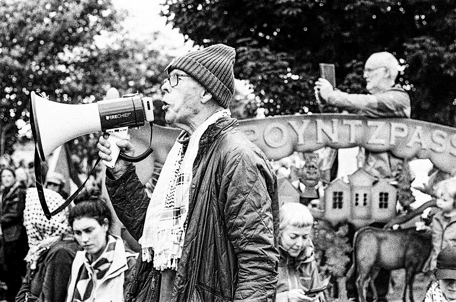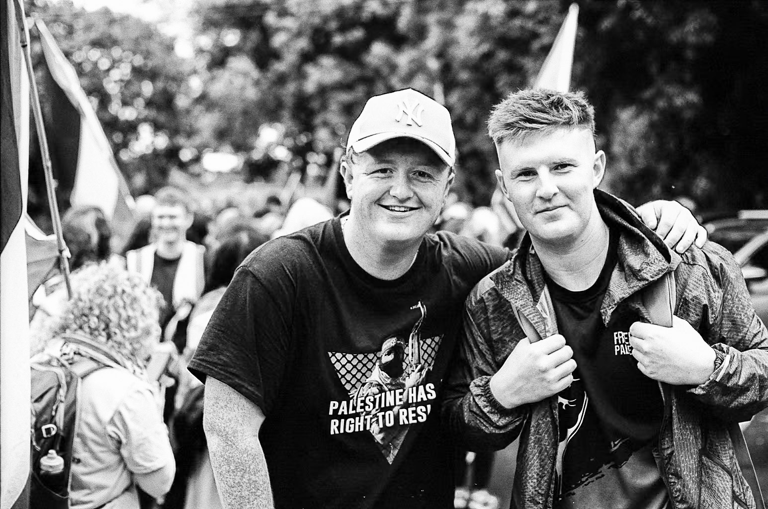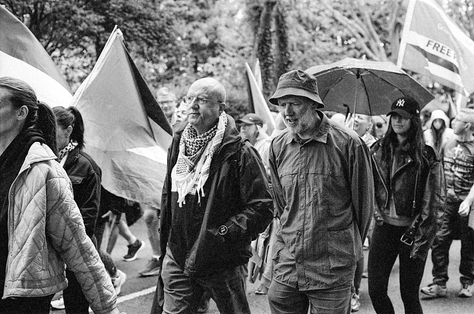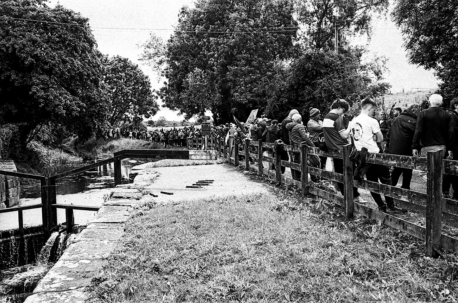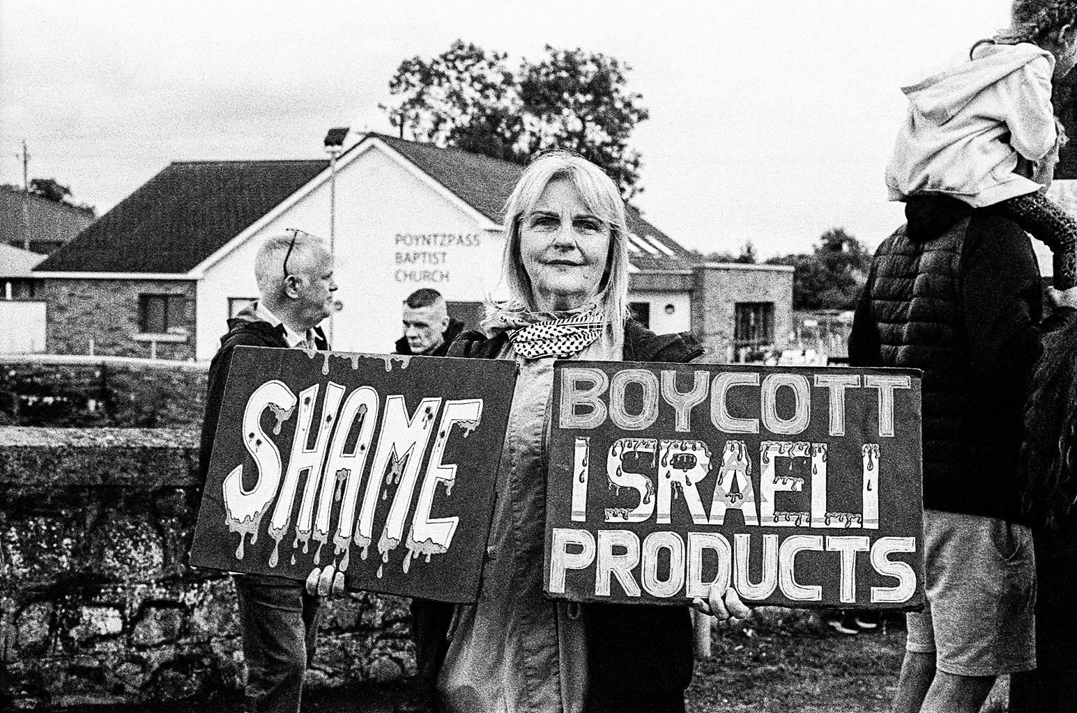 I documented several protests for Gazza including a long walk from Lurgan, County Armagh to Newry, County Down. I used the same equipment and film stocks of the mid-late 20th Century that covered US civil rights and anti Vietnam protests. My aim was to draw contemporary protest photos with pen and inks used by their historical forebears. Working in this fashion I hope to draw parallels and remove aesthetic differences to enable greater understanding.